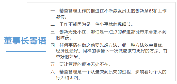 最后,公司董事長(zhǎng)吳政杰先生作了精彩的點(diǎn)評(píng)并提出了新的要求,希望各部門(mén)再接再厲,將精益管理工作持續(xù)、深入地推進(jìn)下去。